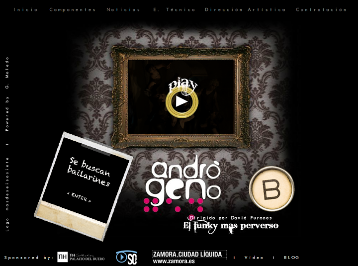 Web de presentación del grupo de baile Andrógeno, orientada a presentar su trabajo y ofrecer su contratación. Trabajo en el que el aspecto visual tiene un peso importante, se ha optado por el uso de Flash para integrar elementos de vídeo en el diseño.