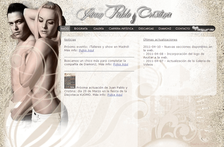 Web promocional creada para la pareja de bailarines Juan Pablo y Cristina. Debido a su carácter de tarjeta de presentación, se ha trabajado en un diseño moderno y elegante, y se ha estructurado el sitio para facilitar las actualizaciones periódicas. Asimismo, se ha ofrecido al cliente un paquete todo-en-uno que incluye diseño, mantenimiento, hospedaje y registro del dominio.